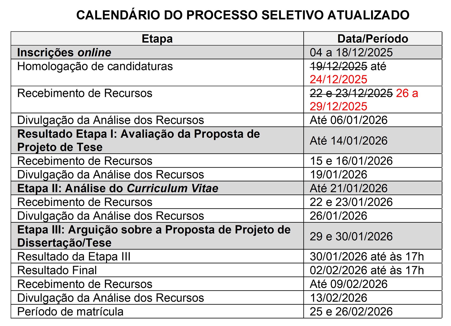A homologação das inscrições será divulgada até as 12h do dia 24/12/2025 e o período recursal ocorrerá entre os dias 26 e 29 de dezembro de 2025.